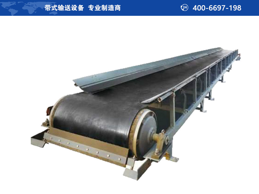 橡胶输送带缠绕经过两端滚筒后,用专用胶带卡子或冷粘粘接或硫化方法,将两头接在一起,使橡胶输送带成为闭环结构。胶带由上、下托辊支承着,由拉紧装置将橡胶输送带拉紧,且拉到一定的张力。当传动滚筒被电动机带动而旋转时,借助于传动滚筒与橡胶输送带之间的摩擦力带着胶带连续运转,从而将装到胶带上的物料、货载从卸料处卸载,完成传送工作。
