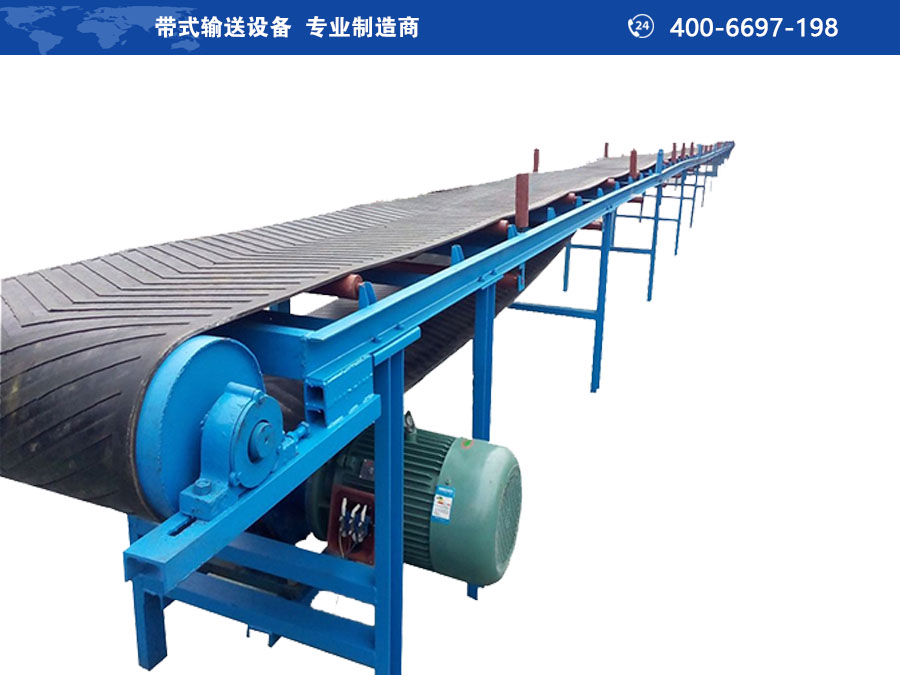 橡胶输送带缠绕经过两端滚筒后,用专用胶带卡子或冷粘粘接或硫化方法,将两头接在一起,使橡胶输送带成为闭环结构。胶带由上、下托辊支承着,由拉紧装置将橡胶输送带拉紧,且拉到一定的张力。当传动滚筒被电动机带动而旋转时,借助于传动滚筒与橡胶输送带之间的摩擦力带着胶带连续运转,从而将装到胶带上的物料、货载从卸料处卸载,完成传送工作。