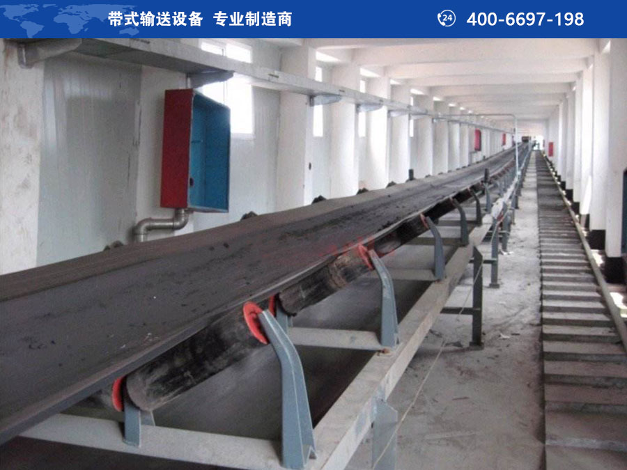橡胶输送带缠绕经过两端滚筒后,用专用胶带卡子或冷粘粘接或硫化方法,将两头接在一起,使橡胶输送带成为闭环结构。胶带由上、下托辊支承着,由拉紧装置将橡胶输送带拉紧,且拉到一定的张力。当传动滚筒被电动机带动而旋转时,借助于传动滚筒与橡胶输送带之间的摩擦力带着胶带连续运转,从而将装到胶带上的物料、货载从卸料处卸载,完成传送工作。