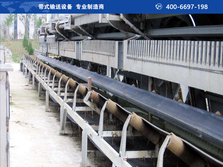 橡胶输送带缠绕经过两端滚筒后,采用硫化或粘接接头,使橡胶输送带成为闭环结构。胶带由上、下托辊支承着,由拉紧装置将橡胶输送带拉紧,且拉到一定的张力。当传动滚筒被电动机带动而旋转时,借助于传动滚筒与橡胶输送带之间的摩擦力带着胶带连续运转,从而将装到胶带上的物料、货载从卸料处卸载,完成传送工作。
